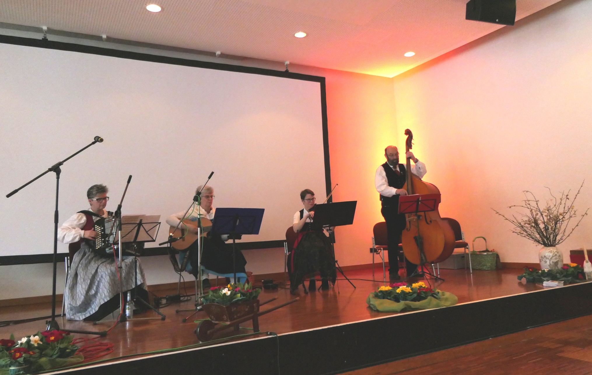 Pünktlich um 14.45h am Sonntag, 12.03.2023, gab die Schässloh-Musig aus Neckarhausen den Start mit einem Musikstück. Zwischendurch gaben die vier Musiker immer wieder Stücke aus ihrem Repertoire zum Besten und spielten auch Stücke zum Mitsingen. Im Übrigen verrieten sie auch, wie es zu ihrem kuriosen Namen kam: Da es im Winter in ihrem Probenraum zu kalt war, wichen sie auf Privaträume aus und mussten dazu das Schässloh (Chaiselongue) wegräumen!
