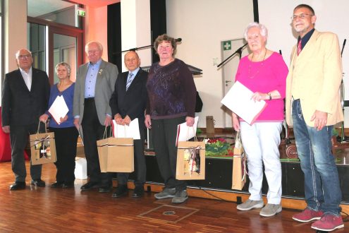 Fünf der achtzehn Jubilare waren anwesend und konnten ihre Urkunden samt Präsent (alles aus der Umgebung) entgegennehmen: Frau Sonja Schach (70 Jahre dabei), Frau Ursula Schmid, Herr Berthold Mainka, Herr Bruno Rehm (alle drei sind 40 Jahre dabei) und noch eine Frau Ursula Schmid (25 Jahre Mitglied). Der Vorsitzende Herr Erich Haas und der Stellvertreter Herr Wolfgang Dietz-Gabriel übernahmen die Ehrungen.